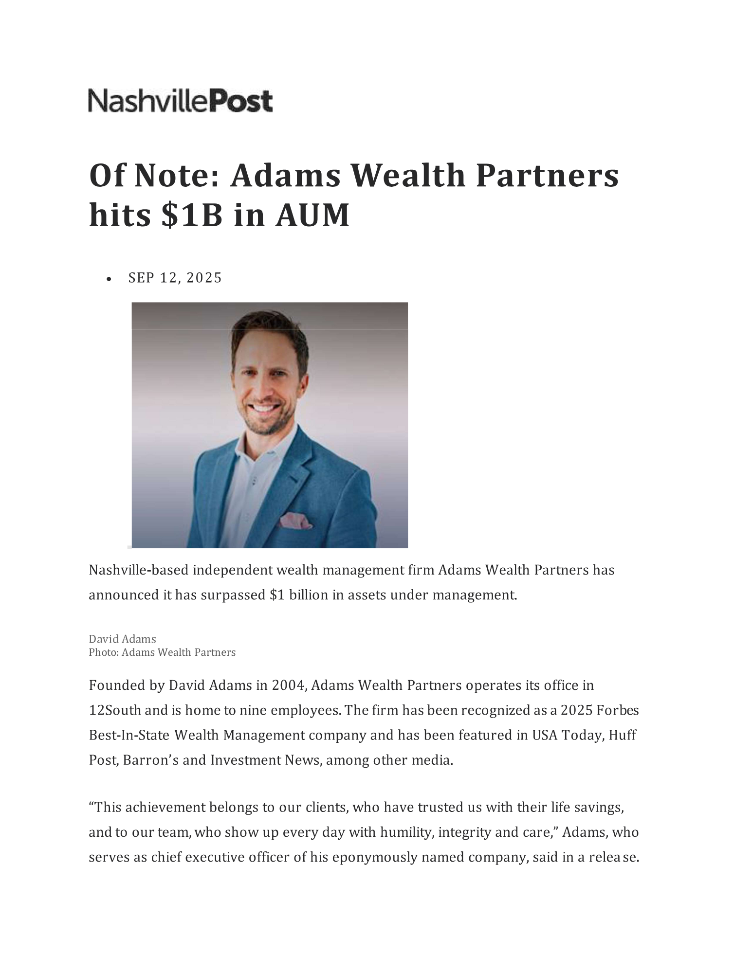 Certified Financial Planner Board of Standards Inc. owns the certification marks CFP®, CERTIFIED FINANCIAL PLANNER™, CFP® (with plaque design) and CFP® (with flame design) in the U.S., which it awards to individuals who successfully complete CFP Board's initial and ongoing certification requirements. CFP® holders at Adams Wealth Partners, LLC are: David Adams, Myles Zueger, Carson Odom, and Spencer Provow